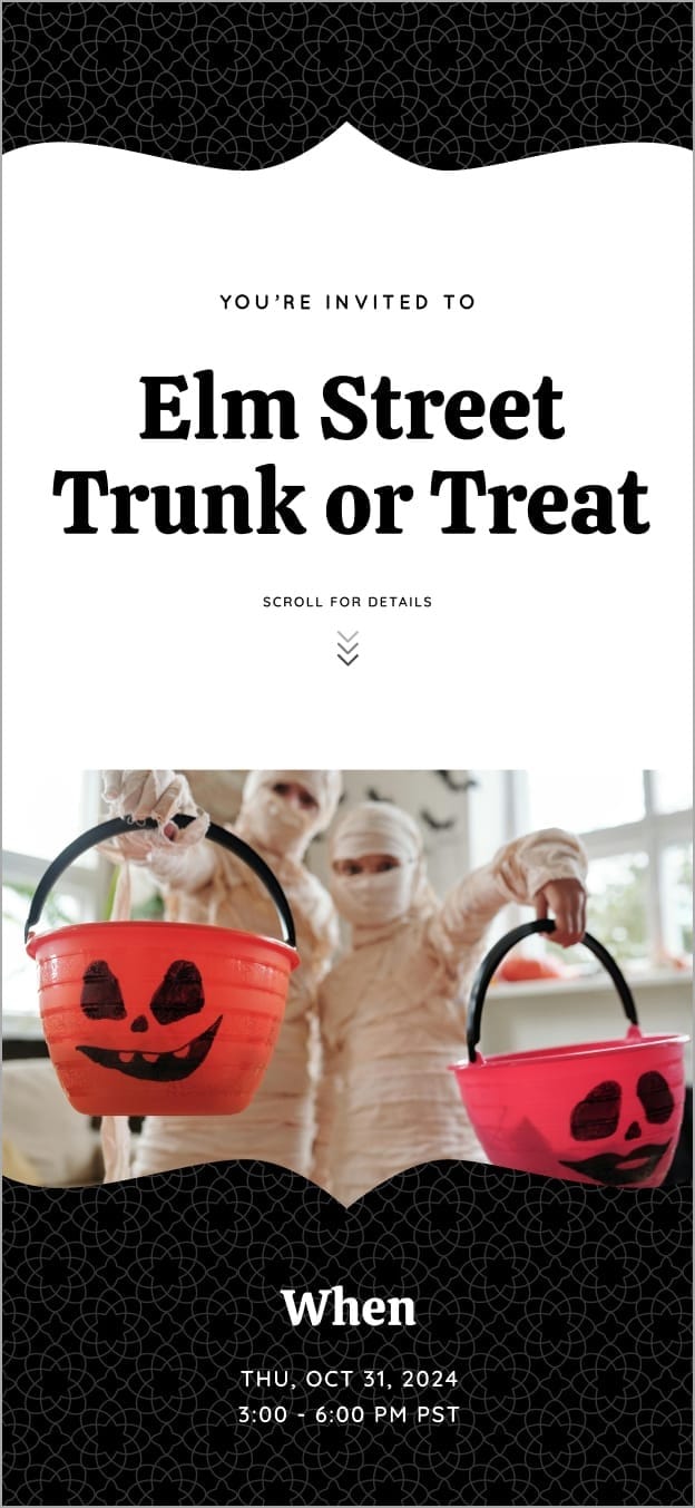 A Trunk or Treat party is a fun and safe way for families and communities to celebrate Halloween. Instead of going door-to-door, participants decorate their car trunks and hand out candy from their vehicles, making it a creative and easy-to-plan event. With Poply online invitation maker, you can customize festive invites to share all the event details and track RSVPs, ensuring everyone knows where to go for a spooky good time!