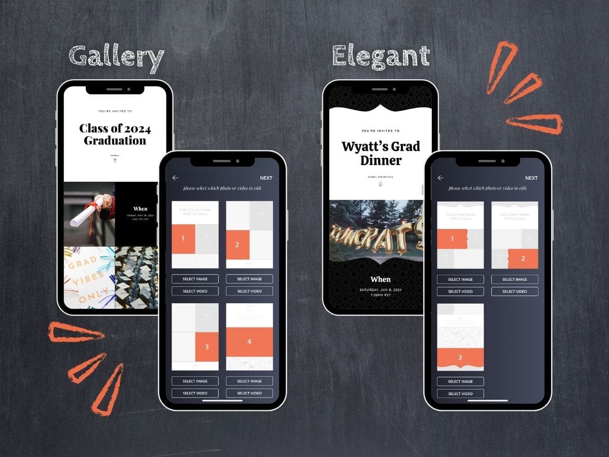 Our Gallery and Elegant Invitations were built with people (and faces) in mind. These templates work great for portraits and group photos and videos! The Elegant Template is perfect for slightly wider media, while the Gallery Template really allows for a collection of favorite photos or video.