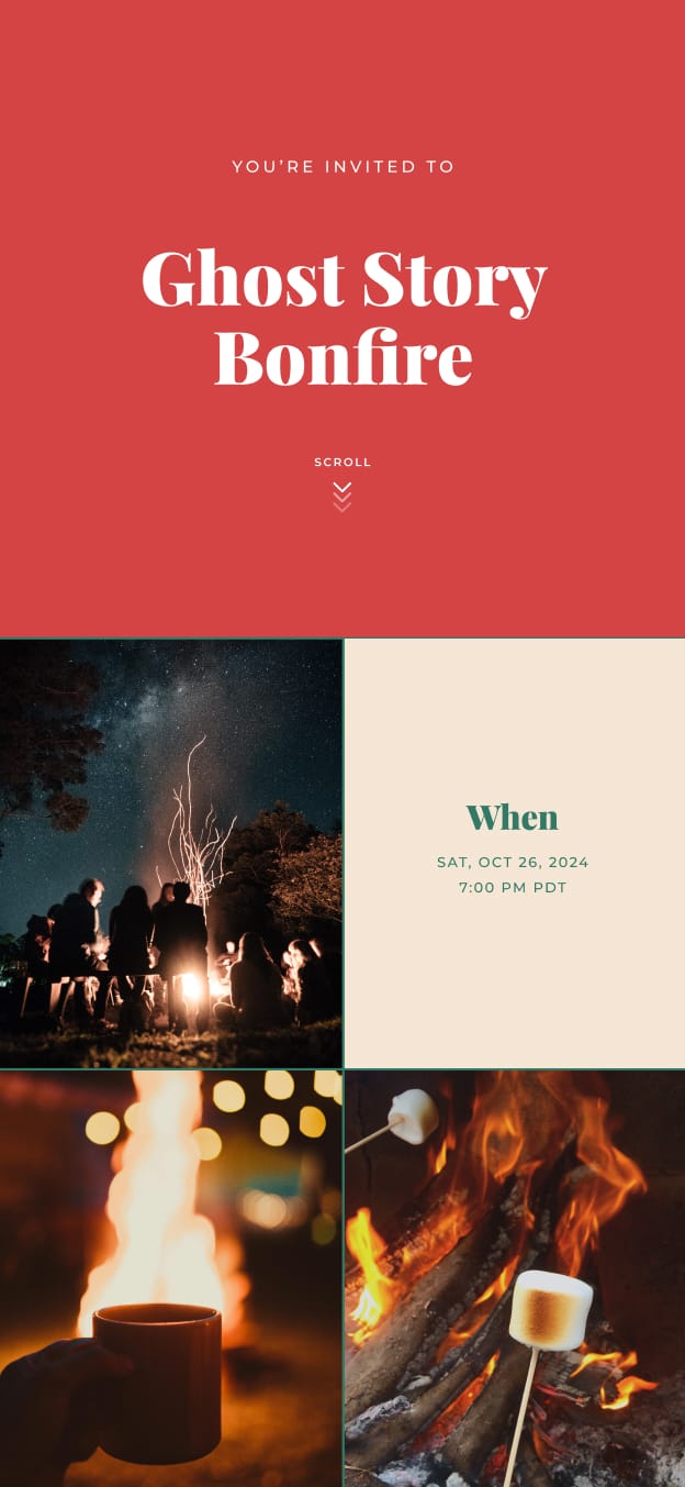 Start by setting the tone with your invitations. When you use a flexible online tool like Poply, you can create custom invites that perfectly capture the theme of the evening. Add photos or videos and choose a designer color theme to personalize your invitation. Make sure to include all the important details, like location, time, and a suggestion for guests to dress warmly and bring their favorite blanket or chair to stay cozy by the fire.