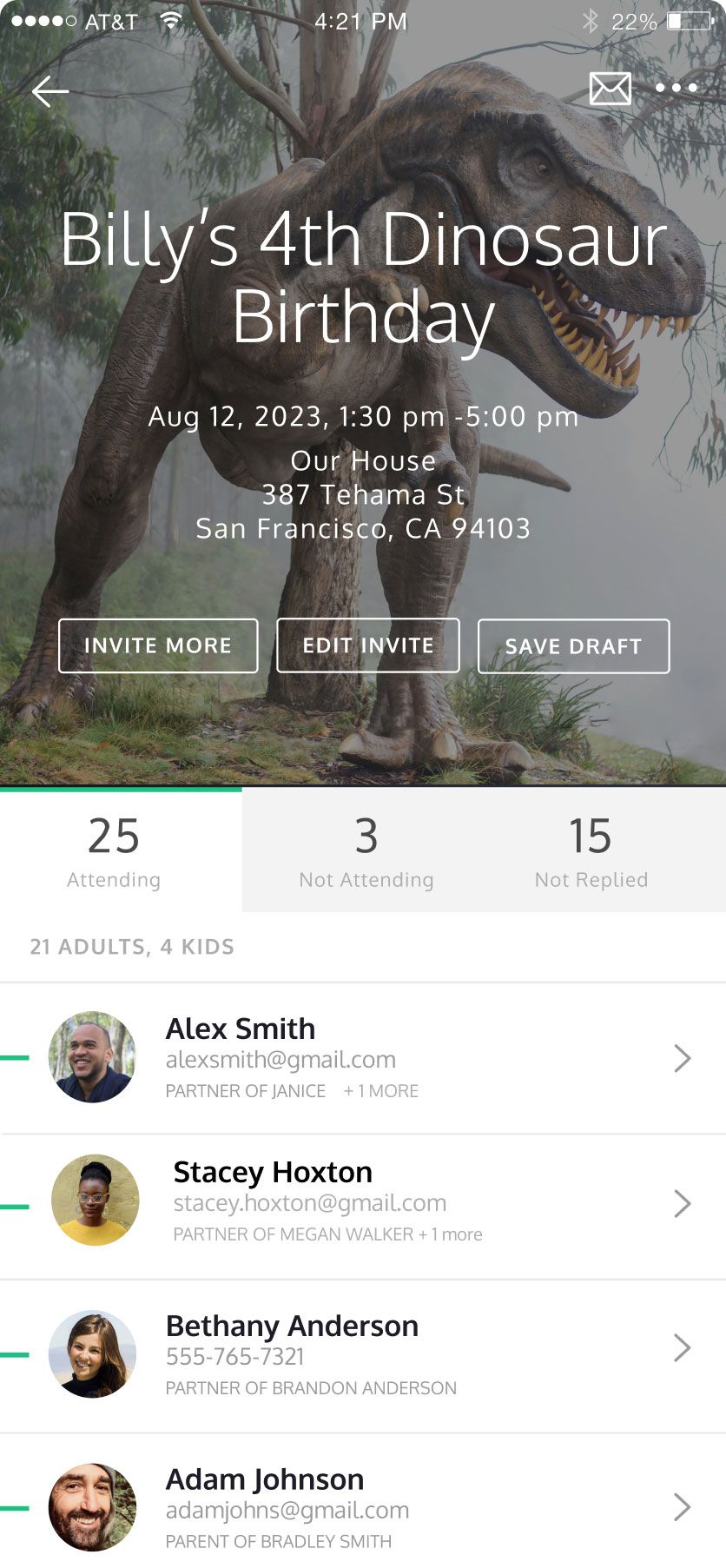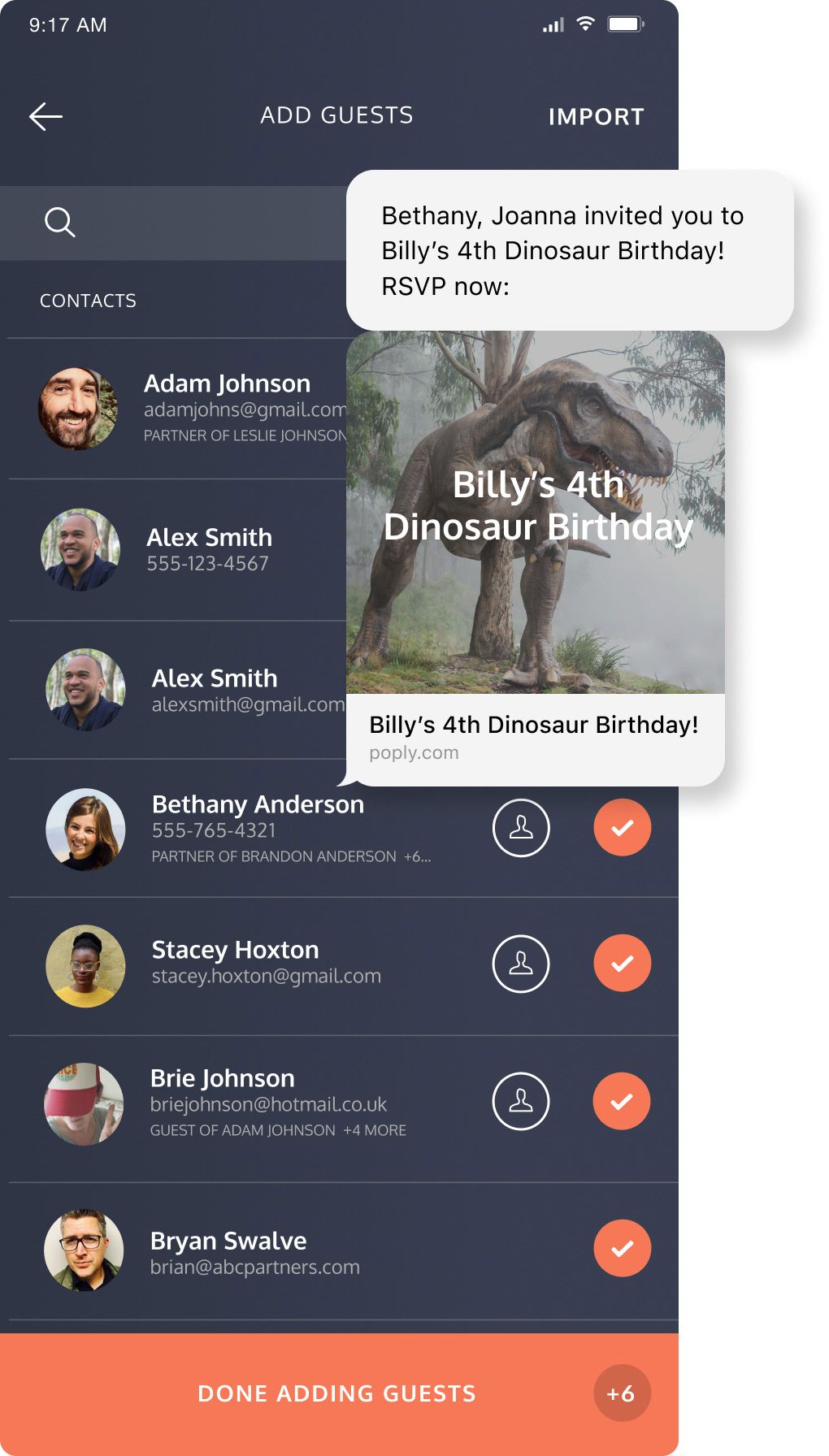 Once you've customized your invitation, it's time to send it out to your guests. Poply makes it easy to send invitations via email or text message. After the invites go out, you can track guests' RSVPs through the platform to see who's coming or you can update guests' attending status for those times you get a verbal response from a friend on the playground. Make it extra easy to keep track of RSVPs by adding the Poply widget to your iPhone's home screen!