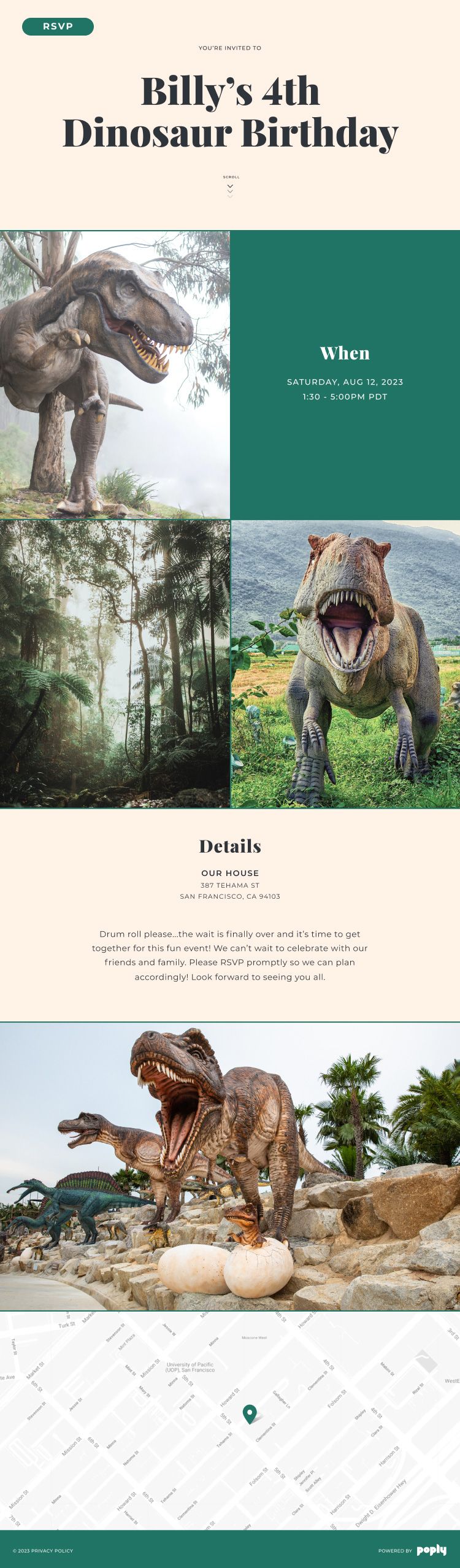 Start by creating a custom invitation that's tailor-made for your event. Poply invitations are fully customizable, so you can add event details, designer color themes, your own photos, and even videos to make the invitation more personal and special. Include details such as the party location, date, and time, as well as any other important information about the event. You can add clickable links to your description for a gift registry or additional details about the venue.