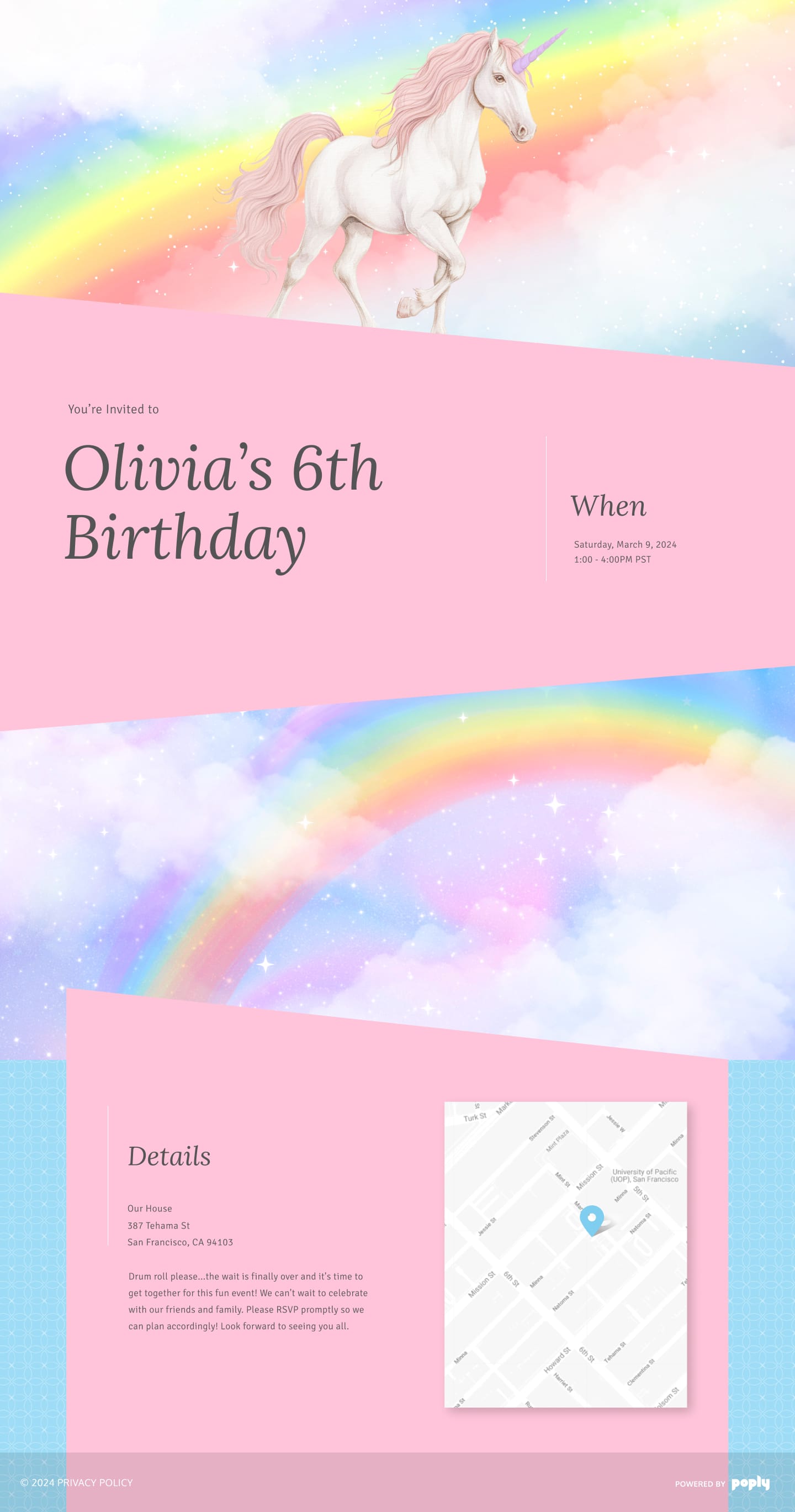 With Poply's new Pink Princess color theme, planning your event just got easier - and much more charming. Whether it's a birthday, baby shower, or Easter gathering, our online invitation maker is ready to add a touch of pastel perfection to your digital invites. Try it today to make your next celebration truly special!