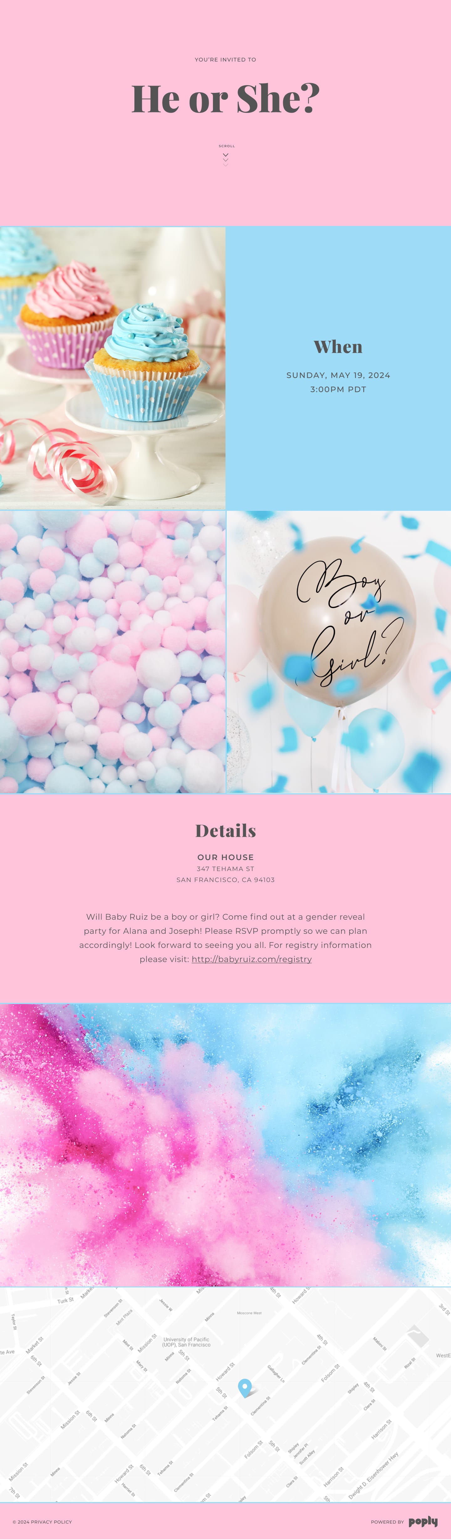 Poply's pink/blue color theme couldn't be more perfect for gender reveals, showers, or baby introduction parties! Upload your own photos or videos or choose from our gallery of free professional photos to perfectly set the theme of your event. You can also insert baby registry links directly into the invitation description, allowing guests to click on them when they view the invitation.