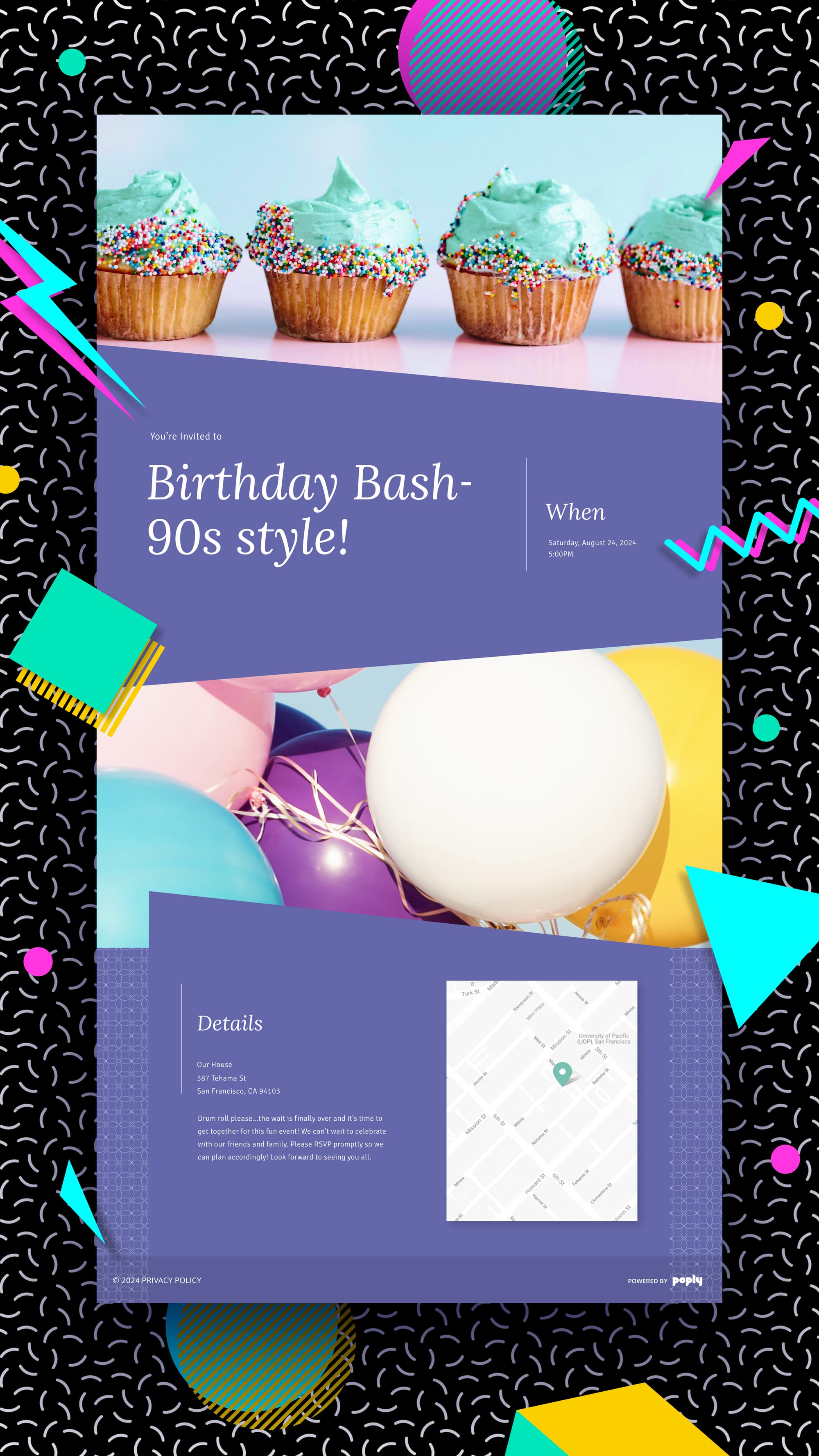 Ready to relive the best of the 90s? Bring back this bold decade's iconic music and unforgettable fashion with a 90s-themed adult birthday party. With Poply online invitation maker, you can set the tone for your party by sending out stylish digital invites. Get your scrunchies and Doc Martens ready—here are our ideas to make this blast from the past totally rad!